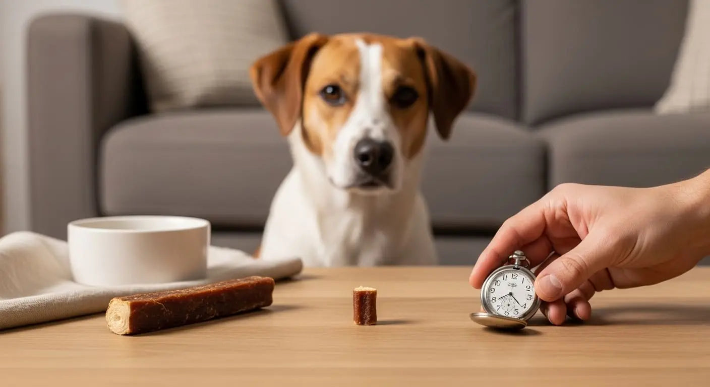 When it's been chewed down to 2-3 inches. A simple test: if your dog can no longer hold the stick with their paws while chewing, it's too small and becomes a choking risk. For first-time chewers, start with short sessions and increase gradually over a week.