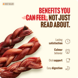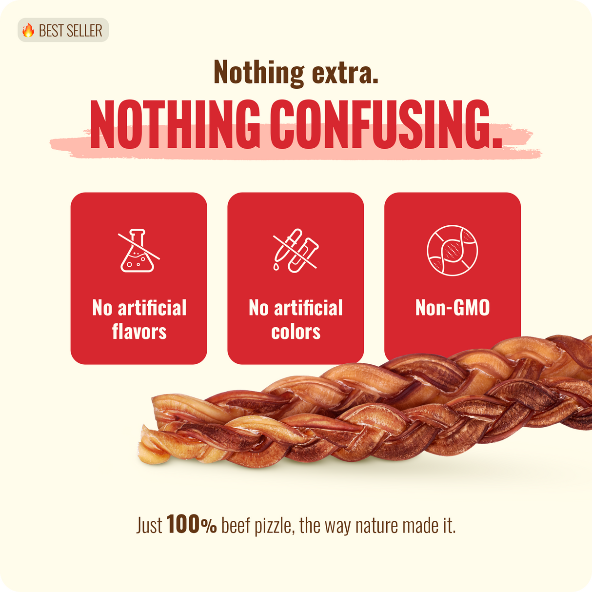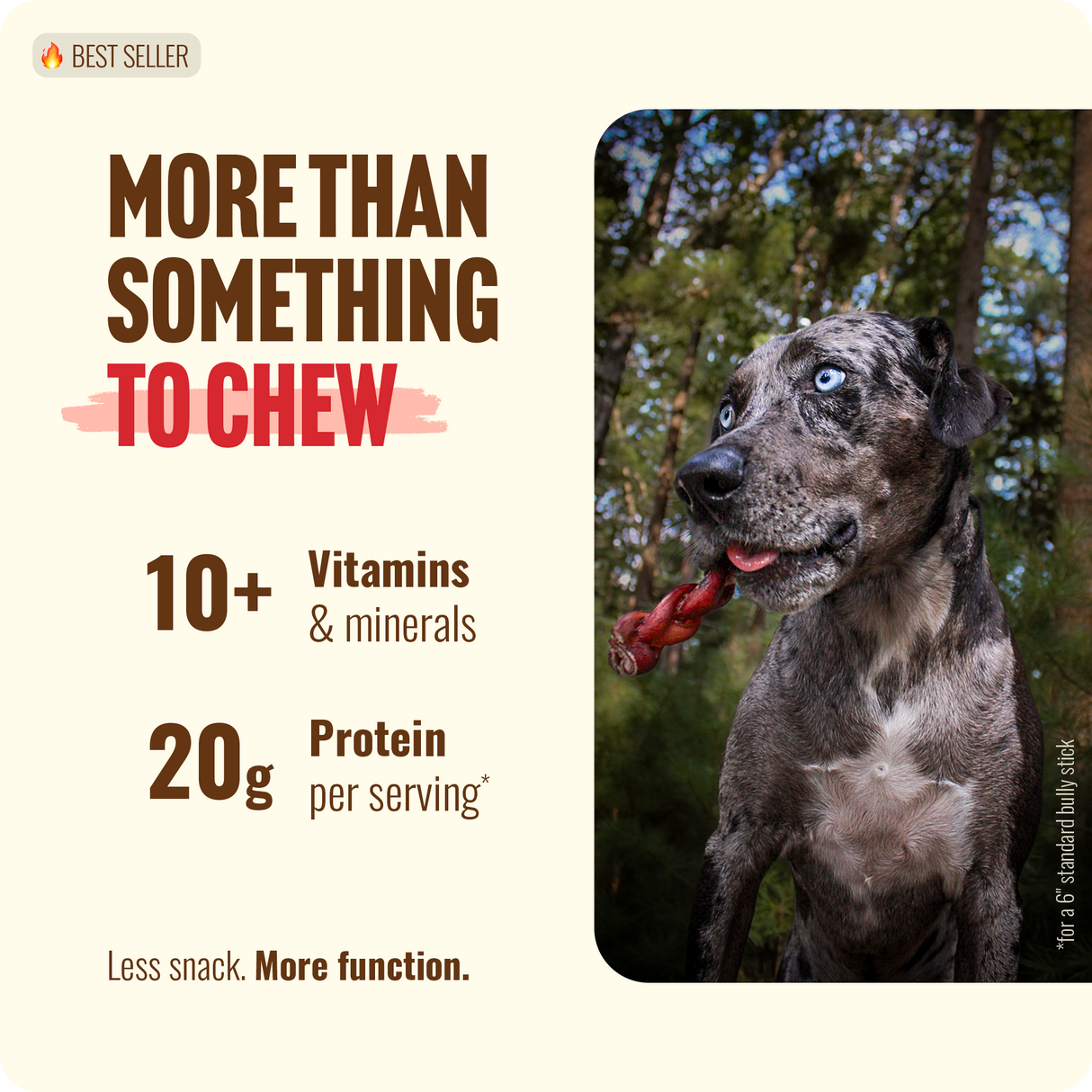 All-natural braided bully sticks for naturally heavy chewers. Braided bully sticks offer optimal engagement while removing plaque and tartar from dogs’ teeth. Three sticks braided into one: full of flavor and fun. Provide a boost of amino acids for holistic health.