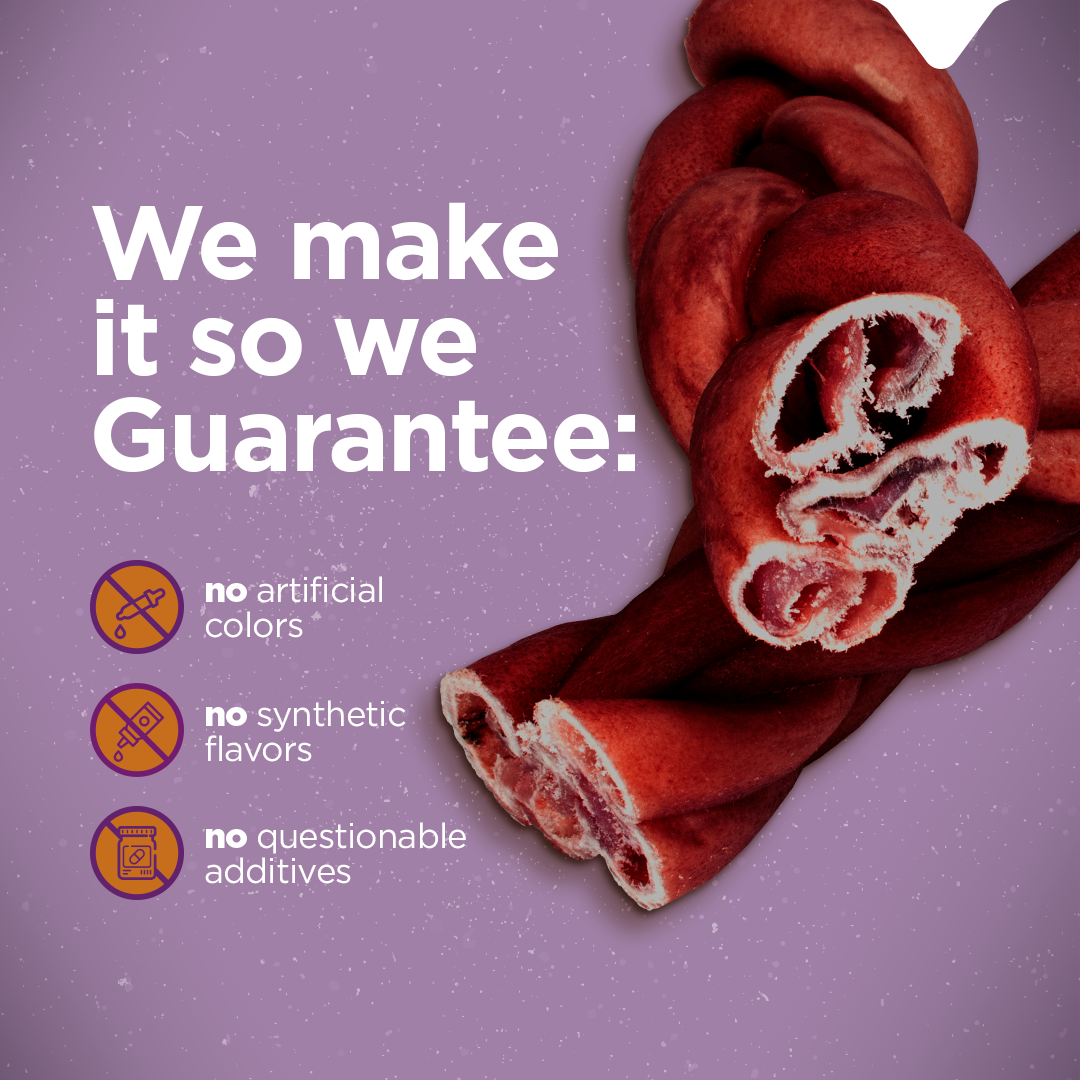 Always monitor your dog closely when introducing a new treat and provide plenty of fresh water. We recommend that you minimize chew time to 3-5 minutes at first and increase over a 5-day period. Be extra attentive to young dogs & puppies, and steer away from chews altogether for puppies under 3 months. Our treats & chews should never replace your dog’s diet and are not meant for human consumption.