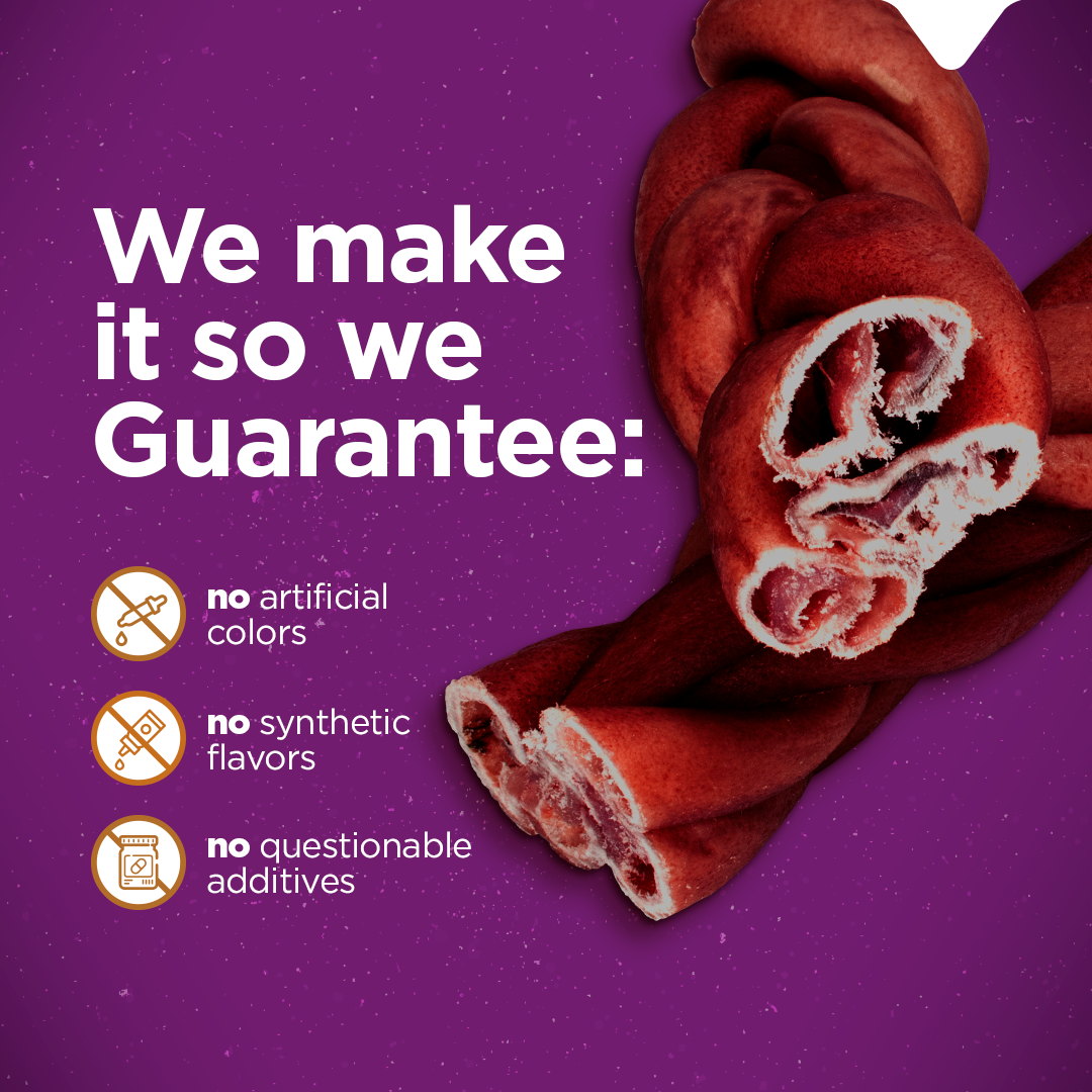 Always monitor your dog closely when introducing a new treat and provide plenty of fresh water. We recommend that you minimize chew time to 3-5 minutes at first and increase over a 5-day period. Be extra attentive to young dogs & puppies, and steer away from chews altogether for puppies under 3 months. Our treats & chews should never replace your dog’s diet and are not meant for human consumption.
