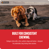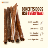 Your dog’s favorite chew treats just got tastier – now with a new name! Natural Farm’s 12-Inch Bully Coated Gourmet Collagen Sticks are dipped in a decadent, all-natural stew of beef and water for an exceptional chewing experience that’s even more flavorful. Each stick contains 95% collagen and premium quality beef for wholesome, long-lasting fun and real beef flavor. A rich source of amino acids for brain health, bone density, a healthy coat, and joint support. Our highly digestible Collagen Sticks are a better, safer alternative to traditional rawhide.