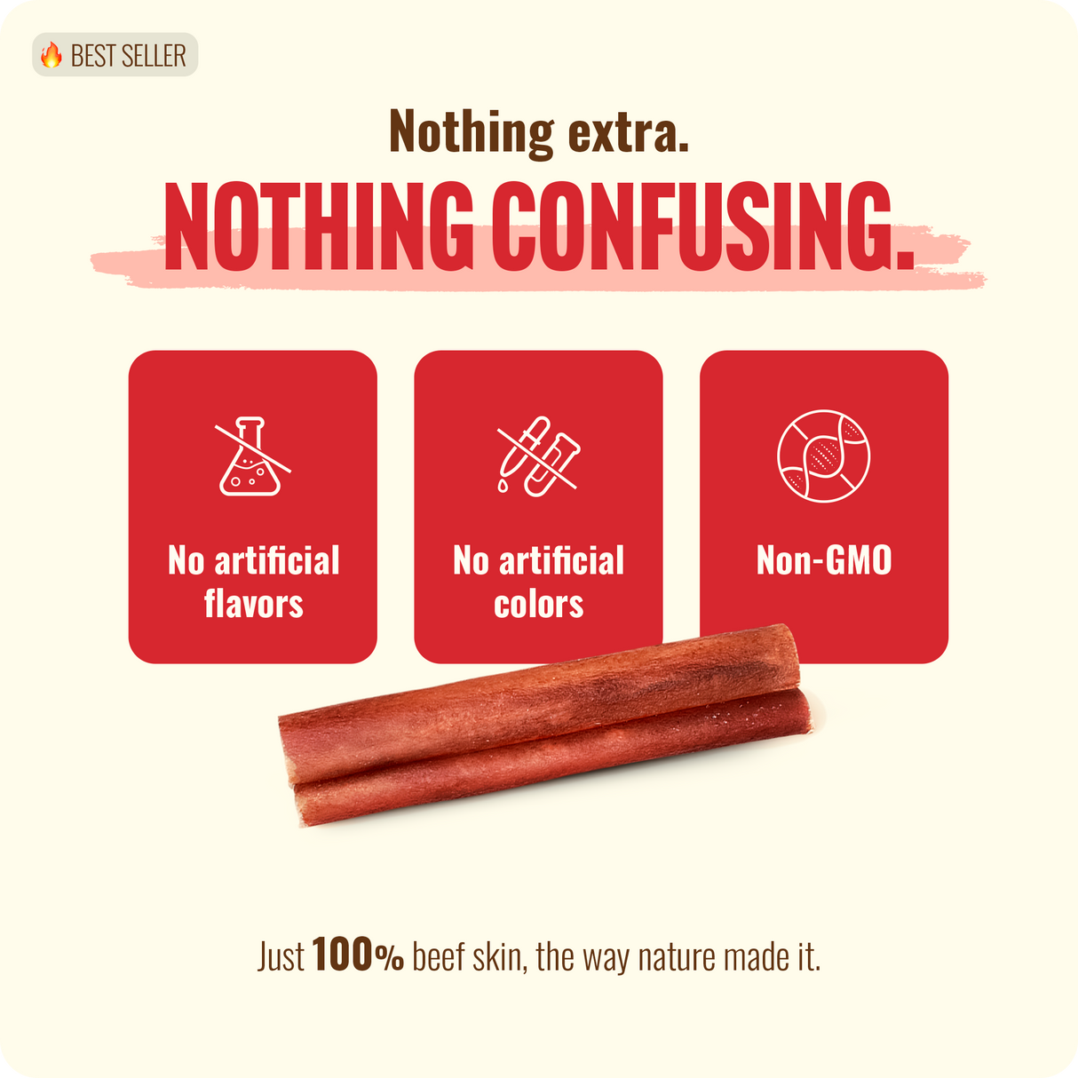 - Single-ingredient: 100% Angus beef skin