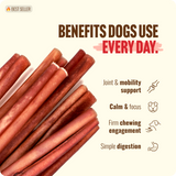 Looking for a bully stick alternative? Super Collagen Sticks are the ultimate choice! Crafted from 100% Angus beef skin, Super Collagen Sticks mimic the look and feel of traditional bully sticks. However, their unique cut ensures they offer more meat and a collagen boost for joint, skin, and coat health. Providing a long-lasting, odor-free chew, they're ideal for hard chewers.