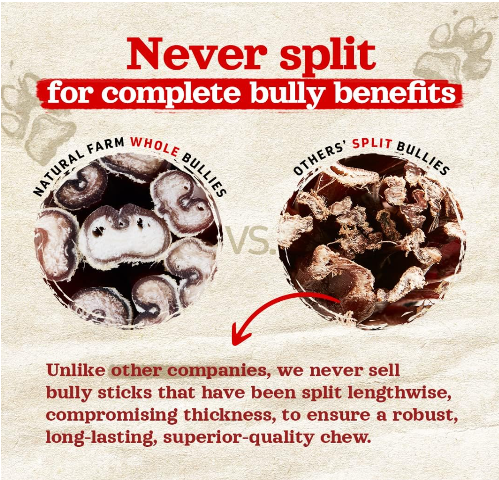 Meaty and long-lasting: Our 2-4 Inch Bully Sticks keep dogs mentally stimulated while treating them to a boost in high-quality protein. A positive outlet for your dog’s chewing instinct (a way to relieve stress and excess energy). Bully sticks are fully digestible and remove plaque as your dog chews. They are also a rich source of amino acids for better brain health, stronger muscles, and joint support. Great for a shiny coat, too. Natural Farm Bully Sticks never contain preservatives or additives, and they’re made from 100% grass-fed beef.