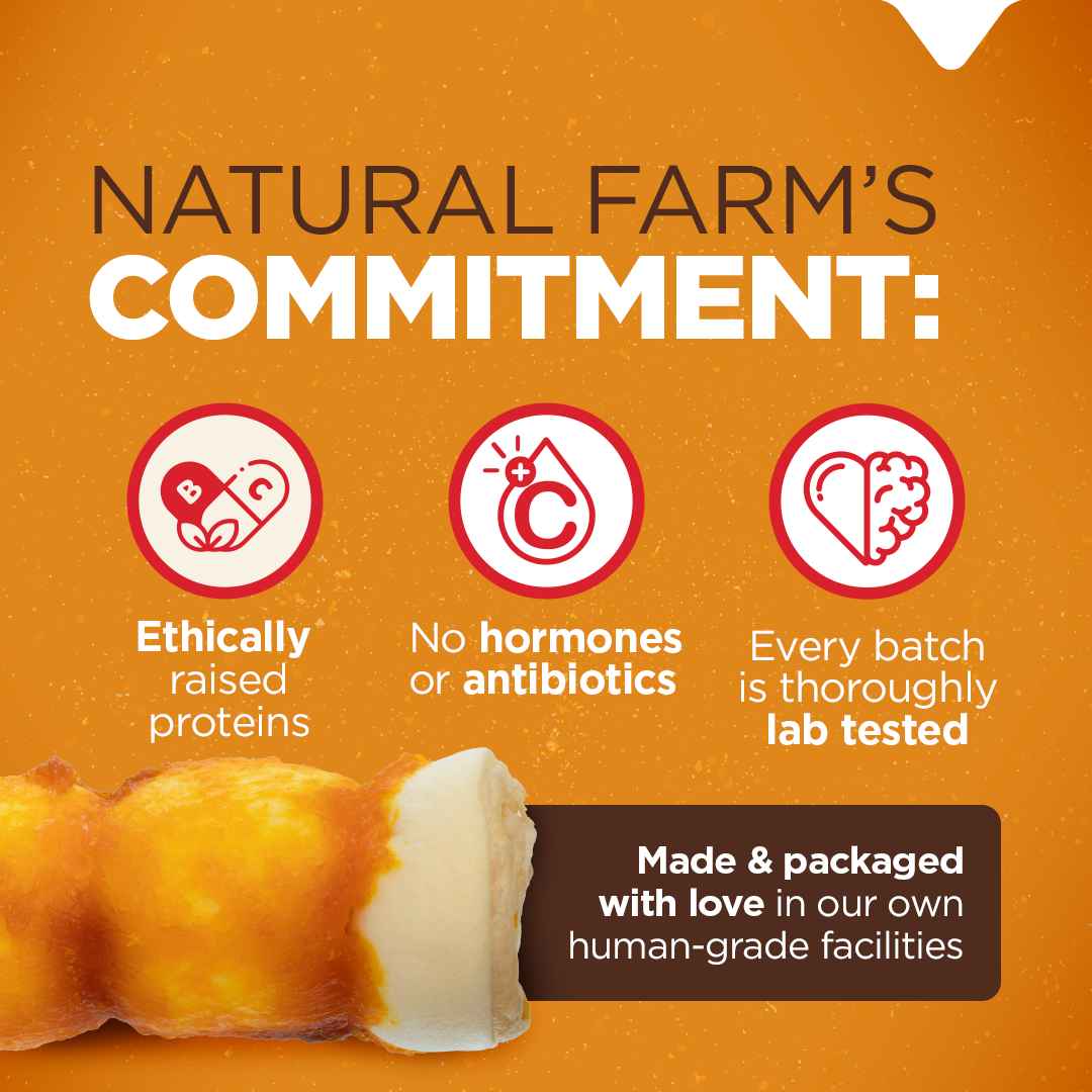 Always monitor your dog closely when introducing a new treat and provide plenty of fresh water. We recommend that you minimize chew time to 3-5 minutes at first and increase over a 5-day period. Be extra attentive to young dogs & puppies, and steer away from chews altogether for puppies under 3 months. Our treats & chews should never replace your dog’s diet and are not meant for human consumption.