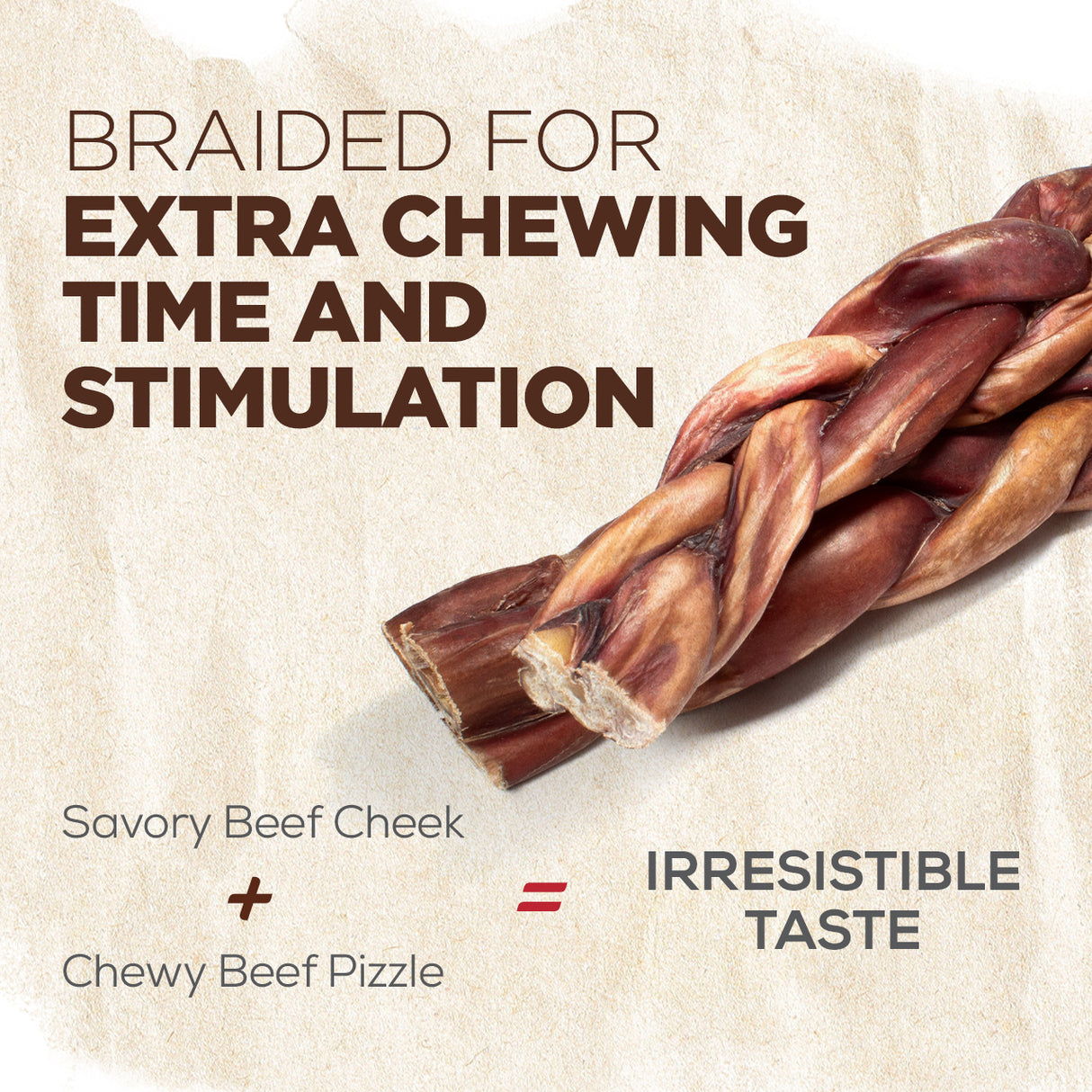 Meet the 6" Braided Power Bully Sticks," awarded the 2023 Best Rawhide Alternative by Award Innovation. These 2-in-1 chews boast premium beef cheek muscle and pizzle sheath, offering double the flavor, fun, and enrichment. Watch your dog enjoy the long-lasting, protein-rich experience while promoting dental health with the braided design. Elevate treat time with this award-winning delight for a superior and enriching chew.
