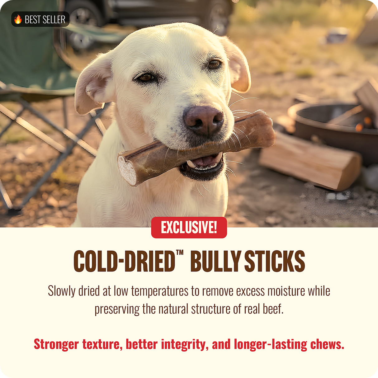 We developed Cold-Dried™ to solve a real problem: dogs that demolish standard bully sticks in minutes. Our process slowly removes excess moisture at low temperatures, preserving the natural protein structure of real beef while creating a denser, firmer, longer-lasting chew.