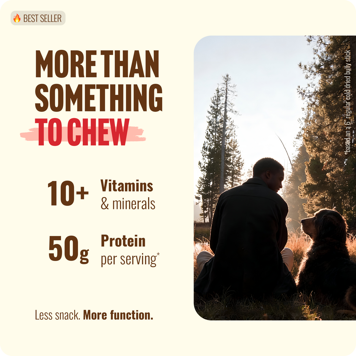 | Nearly 20g Protein Per Stick | Up to 97% crude protein — concentrated through our Cold-Dried™ process. More protein per chew than traditional bully sticks. |