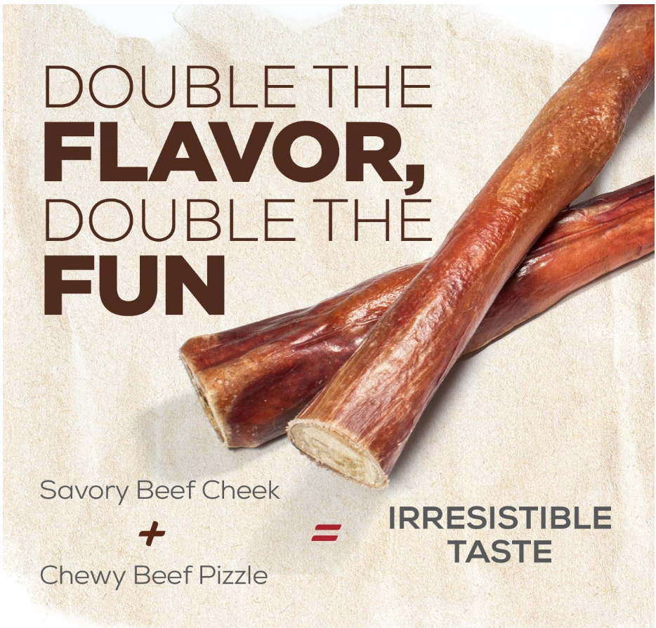 Ingredients: All-natural beef cheek muscle (stick); all-natural beef pizzle sheath (wrap)